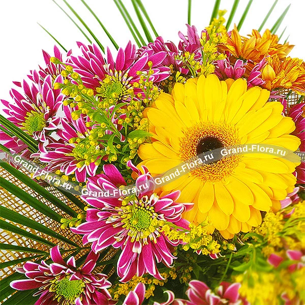 Этот восторженный букет с ярко-желтым гербером в центре заставляет улыбаться навстречу солнцу и ценить прекрасные моменты. Именно один из таких моментов вы можете подарить своим близким, презентовав такой букет. Экзотические нотки добавляют листья зелени, пестрые хризантемы символизируют счастье и долголетие. Наверняка этот букет оценит ваша мама или бабушка, сделайте им очаровательный подарок, заказав букет с доставкой у нас.
